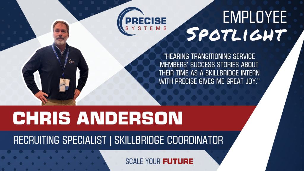 At Precise Systems, our people are the driving force behind our mission. We’re proud to feature Chris Anderson, a member of our Recruiting team who plays an important role in connecting talented professionals—especially transitioning service members—with opportunities at Precise.